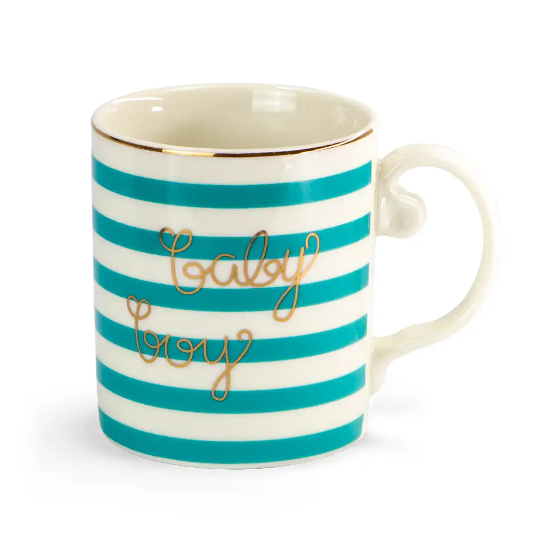 Seu design moderno apresenta listras horizontais e detalhes metalizados delicados, incluindo uma frase decorativa no corpo da peça. O acabamento brilhante realça o visual da caneca, enquanto a alça anatômica proporciona conforto ao segurar.