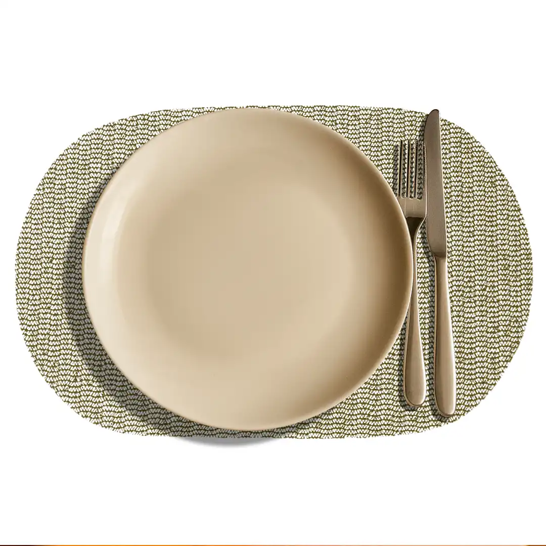 Seu formato oval com acabamento texturizado proporciona um visual moderno e discreto, combinando facilmente com diversos estilos de louças e utensílios. Além disso, a cor bege neutra é versátil e traz suavidade à composição da mesa, valorizando tanto mesas claras quanto escuras.