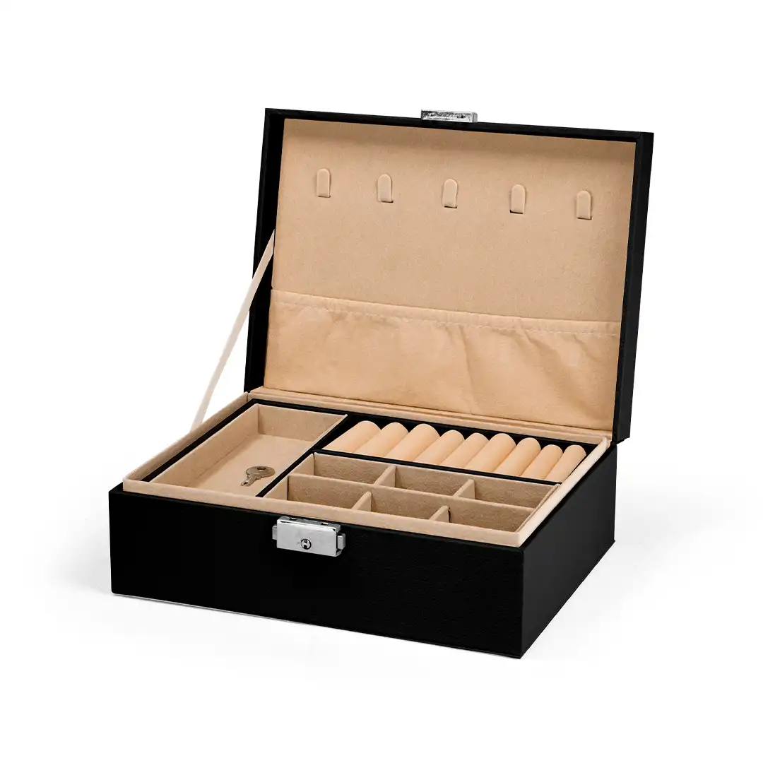 Com estrutura firme e acabamento refinado, o porta-joias possui formato de maleta, fecho metálico de alta durabilidade e divisórias internas (não visíveis na imagem) ideais para armazenar brincos, anéis, pulseiras e colares com segurança e organização.
