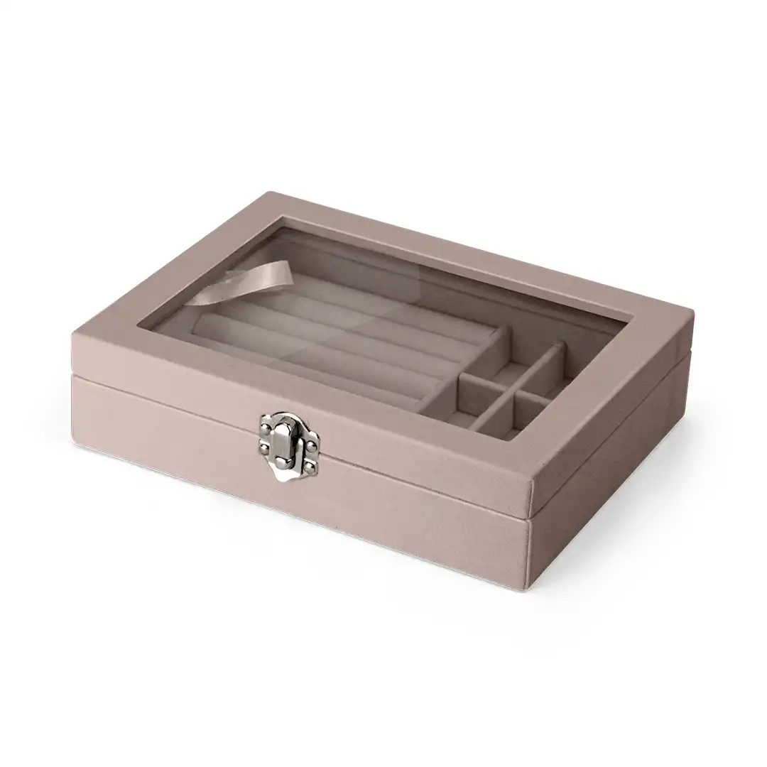 Com estrutura rígida em MDF revestido em veludo macio na cor cinza, o estojo conta com divisórias internas variadas para acomodar diferentes tipos de joias e uma tampa em vidro transparente, que permite visualizar o conteúdo sem precisar abrir. Fecho metálico reforçado garante segurança no armazenamento.